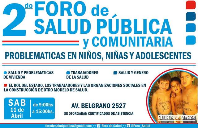 En esta nueva edición del 2do FORO DE SALUD PÚBLICA Y COMUNITARIA buscamos abordar la problemática de niños, niñas y adolescentes desde una visión compleja de la realidad, ubicando la responsabilidad del Estado y el rol de La Comunidad como garantes del cumplimiento de sus derechos.