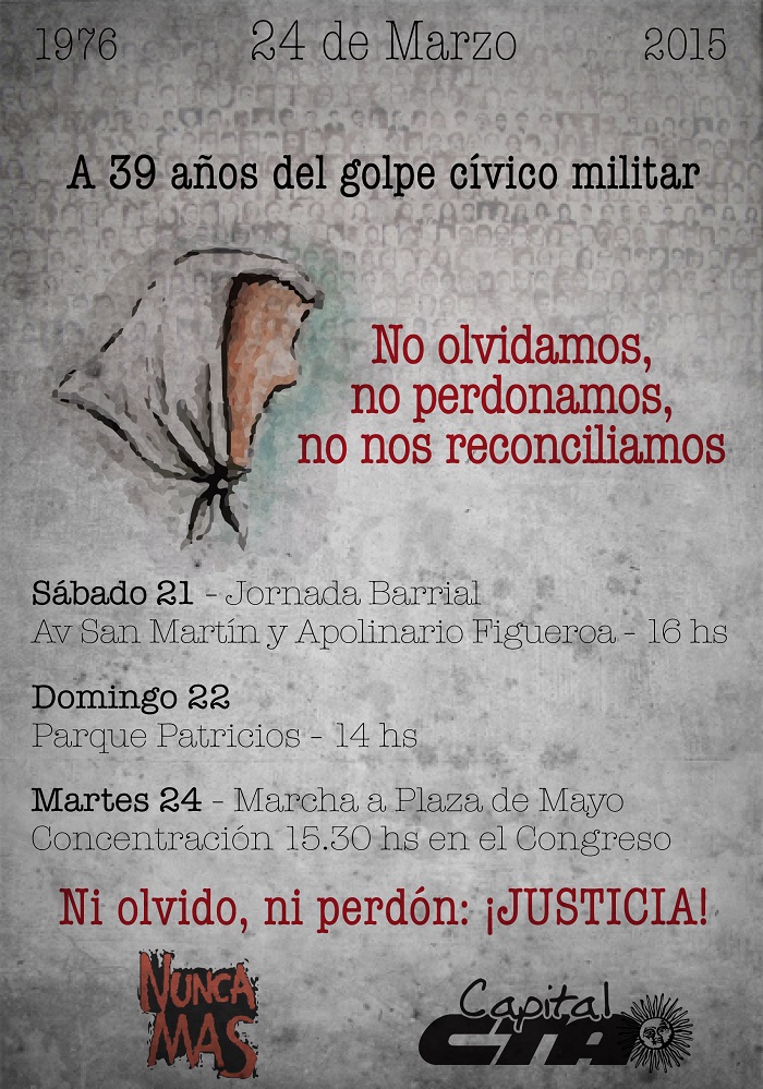 – 24 de marzo, 15.30 horas, concentración en el Congreso de la Nación, para marchar hasta Plaza de Mayo.