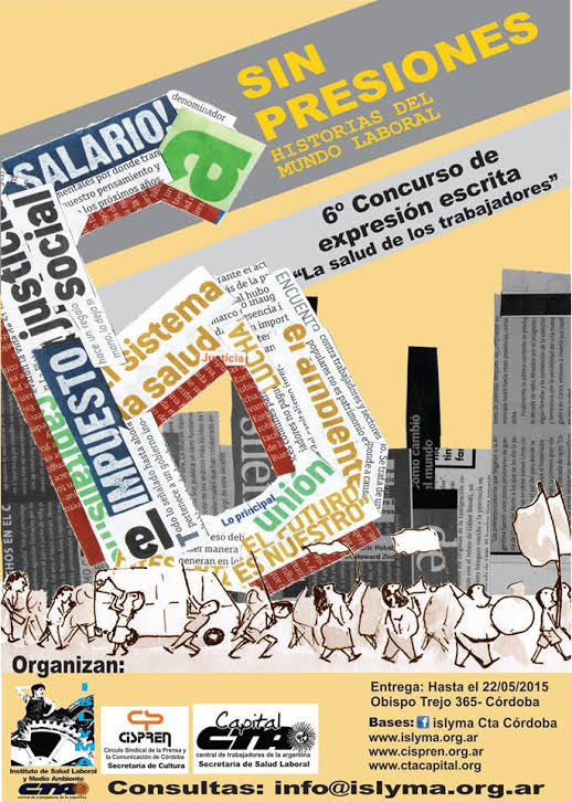 El Círculo Sindical de la Prensa y la Comunicación de Córdoba (CiSPren), la Secretaría de Salud Laboral (CTA) y el Instituto de Salud Laboral y Medio Ambiente de CTA Córdoba (ISLyMA), lanzan la Sexta Convocatoria del Concurso de expresión escrita “Sin Presiones – la salud de los Trabajadores/as“.Bajo la Consigna “Sin presiones – Historias del mundo laboral” se busca que los trabajadores exterioricen sus vivencias y luchas (y las de sus compañeros) al margen de la pulseada con la patronal.