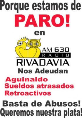 «A su vez, reclamamos que sean escuchados los trabajadores de Radio Rivadavia AM 630 que llevan adelante una nueva jornada de paro en reclamo del sueldo y aguinaldo adeudados, como así también de deudas por retroactivos. En el día de la fecha se ven afectadas las tareas del servicio informativo, ya que la medida cuenta con la total adhesión de periodistas y locutores».