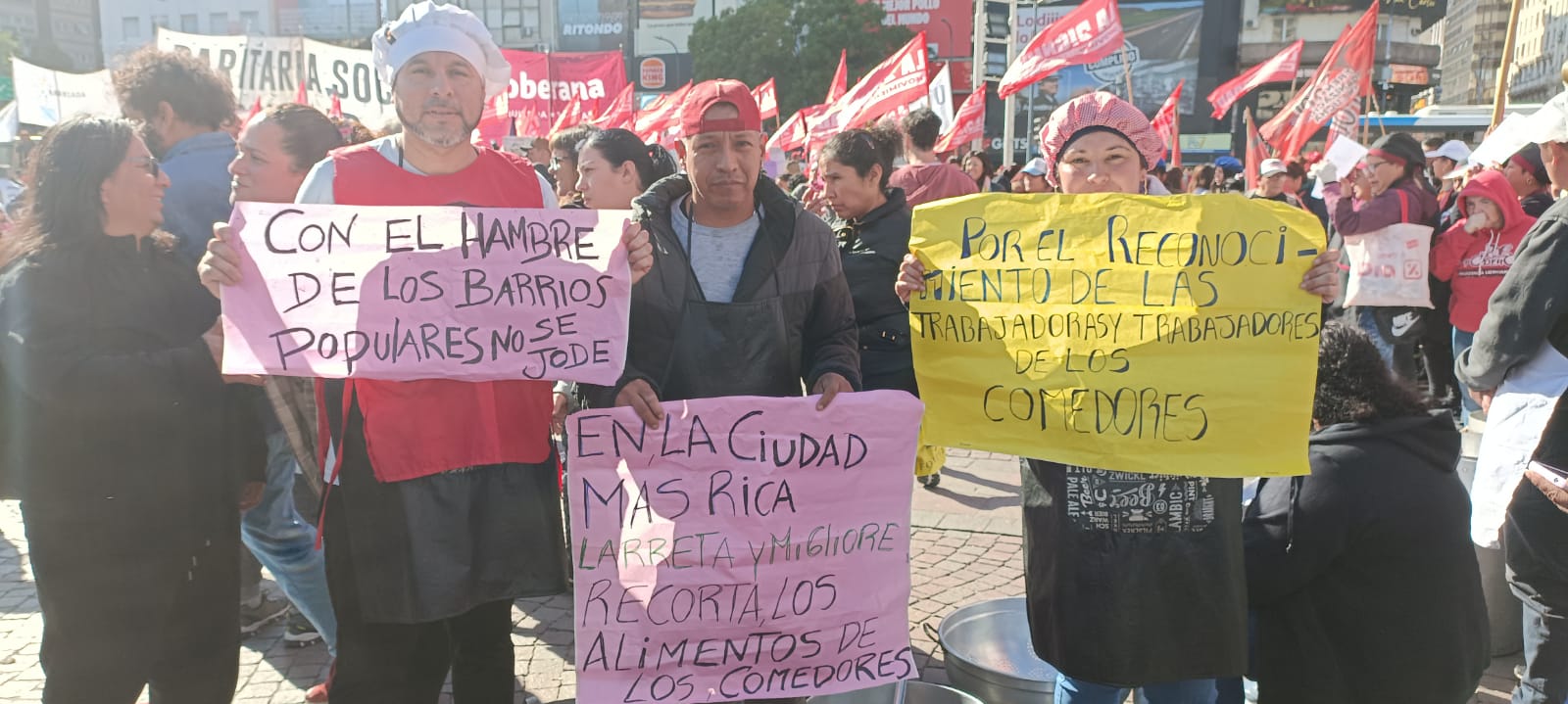 A partir de las 11 de la mañana las y los compañeros de la CTAA Capital y de un conjunto de organizaciones sociales comenzaron a concentarse en la Plaza de la República -Avenida Corrientes y 9 de Julio- con sus ollas, cucharas, delantales y pancartas para hacer visible la situación que vienen padeciendo desde hace años y que cada día se agrava más. Las trabajadoras y trabajadores de los espacios comunitarios de los barrios populares de la Ciudad de Buenos Aires denunciaron la amenaza por parte de Larreta de recortar el programa Ciudadanía Porteña, al mismo tiempo que disminuye la cantidad y la calidad de las raciones de comida que envía a los comedores.