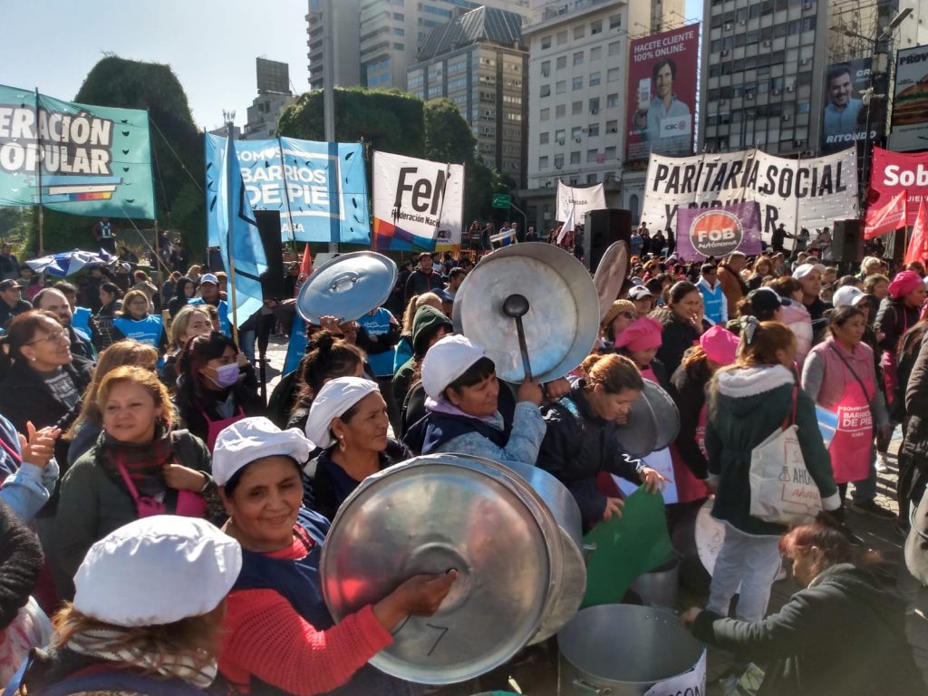 Mabel Mamani, del Frente de Organizaciones Salvador Herrera (FOSH-CTAA), a su turno, agregó: “En estos momentos venimos a reclamar el reconocimiento de las compañeras que todos los días están con las ollas para darles de comer a cientos de personas en nuestros barrios. Queremos que se reconozca a las compañeras con un salario digno.”