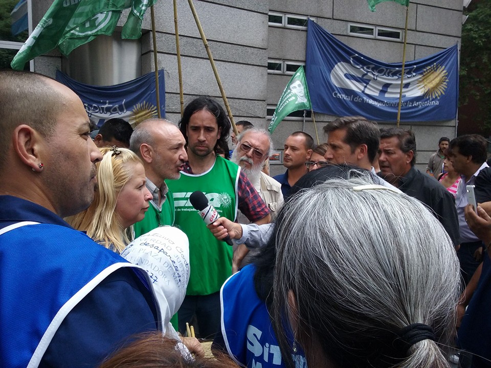 – En este momento la Canciller se ha solidarizado con los trabajadores y mandó un mail desde el lugar donde está, Davos, y nos pidió que nos acerquemos al Vicecanciller. Así que justamente estábamos esperando a que llegara acá, y acaba de llegar, va a subir a hablar un compañero de ATE y acaba de llegar Eduardo Otero, posiblemente suba también él y también voy a participar yo de la reunión, como represente de todos los trabajadores de Maestranza.