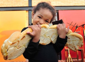 Luis acompañó a los niños con la plegaria del pan y el pan se repartió entre todos como debería ser para que no hubiera hambre en el país de chocolate, leche y miel.