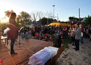 Foto02wPrimero fue mostrar la placa, después del piolín que tiraron Valentín, Isaías y Cielo. Entonces apareció el homenaje a Alberto Morlachetti, el poeta de los niños, que hace un año se fue lejos, montado en globos de colores, buscando transformar y embellecer otros mundos como lo hizo con éste.