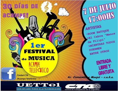A partir de las 17 horas del día de hoy, los telefónicos organizados en la Unión de Empleados Técnicos de la Telefonía (UETTel-CTA) que fueron despedidos, convocan a un Festival de Música.