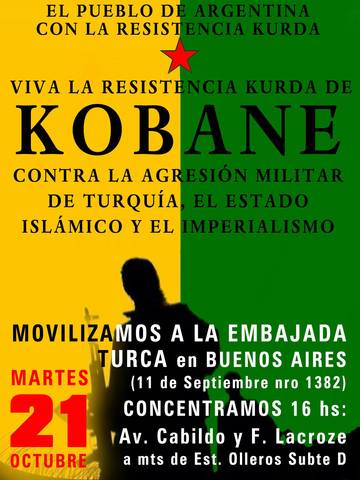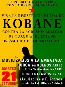 Convocamos a todas y todos, individuos, colectivos y organizaciones a movilizarnos este martes 21 de Octubre a las 16 horas en repudio a las masacres del Estado Islámico y las políticas y colaboración con el terrorismo y de genocidio de Turquía.