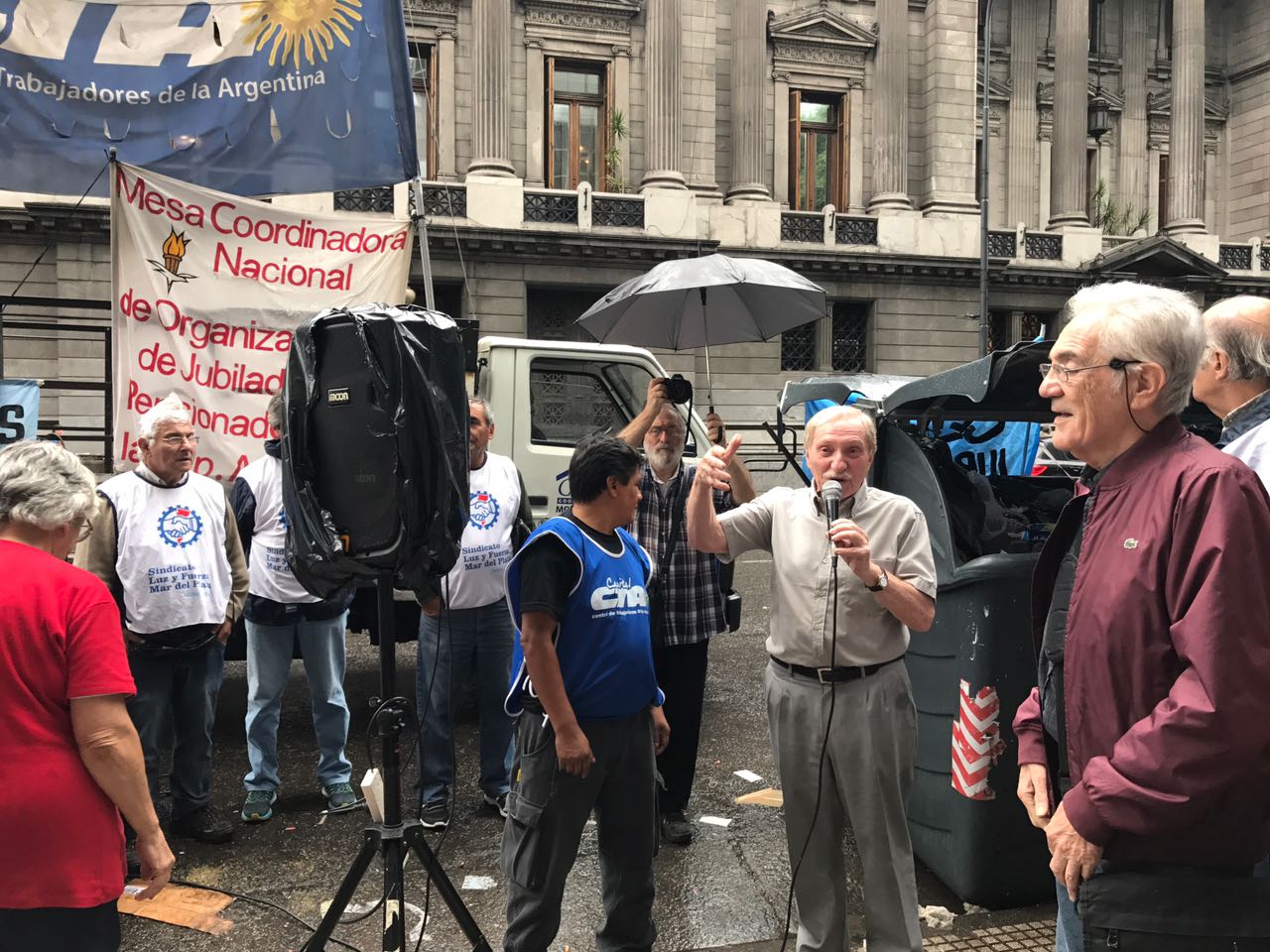 Bajo la torrencial lluvia que caía en la tarde del miércoles de lucha número 1300, los compañeros y compañeras de la Mesa Coordinadora de Jubilados y Pensionados de la República Argentina, acompañados de militantes de distintas organizaciones de la CTA Autónoma y con la presencia de Diputados de la Nación y de medios de comunicación, realizaron su histórica protesta.